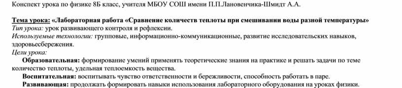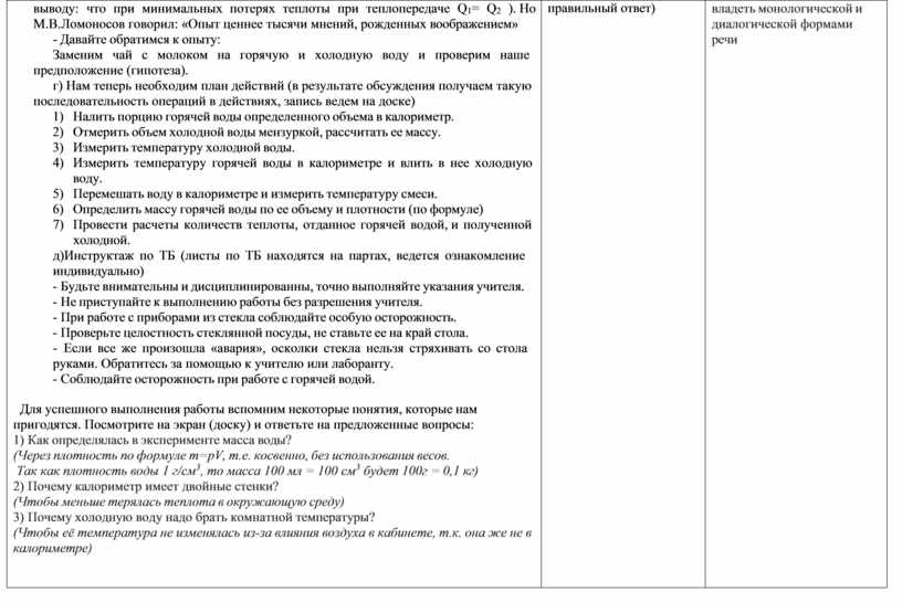 выводу: что при минимальных потерях теплоты при теплопередаче Q1= Q2 ). Но М.В.Ломоносов говорил: «Опыт ценнее тысячи мнений, рожденных воображением» - Давайте обратимся к опыту: Заменим чай с молоком на горячую и холодную воду и проверим наше предположение (гипотеза). г) Нам теперь необходим план действий (в результате обсуждения получаем такую последовательность операций в действиях, запись ведем на доске) 1) Налить порцию горячей воды определенного объема в калориметр. 2) Отмерить объем холодной воды мензуркой, рассчитать ее массу. 3) Измерить температуру холодной воды. 4) Измерить температуру горячей воды в калориметре и влить в нее холодную воду. 5) Перемешать воду в калориметре и измерить температуру смеси. 6) Определить массу горячей воды по ее объему и плотности (по формуле) 7) Провести расчеты количеств теплоты, отданное горячей водой, и полученной холодной. д)Инструктаж по ТБ (листы по ТБ находятся на партах, ведется ознакомление индивидуально) - Будьте внимательны и дисциплинированны, точно выполняйте указания учителя. - Не приступайте к выполнению работы без разрешения учителя. - При работе с приборами из стекла соблюдайте особую осторожность. - Проверьте целостность стеклянной посуды, не ставьте ее на край стола. - Если все же произошла «авария», осколки стекла нельзя стряхивать со стола руками. Обратитесь за помощью к учителю или лаборанту. - Соблюдайте осторожность при работе с горячей водой.