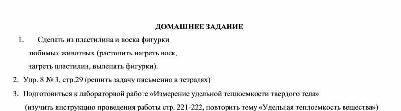 (изучить инструкцию проведения работы стр. 221-222, повторить тему «Удельная теплоемкость вещества»)