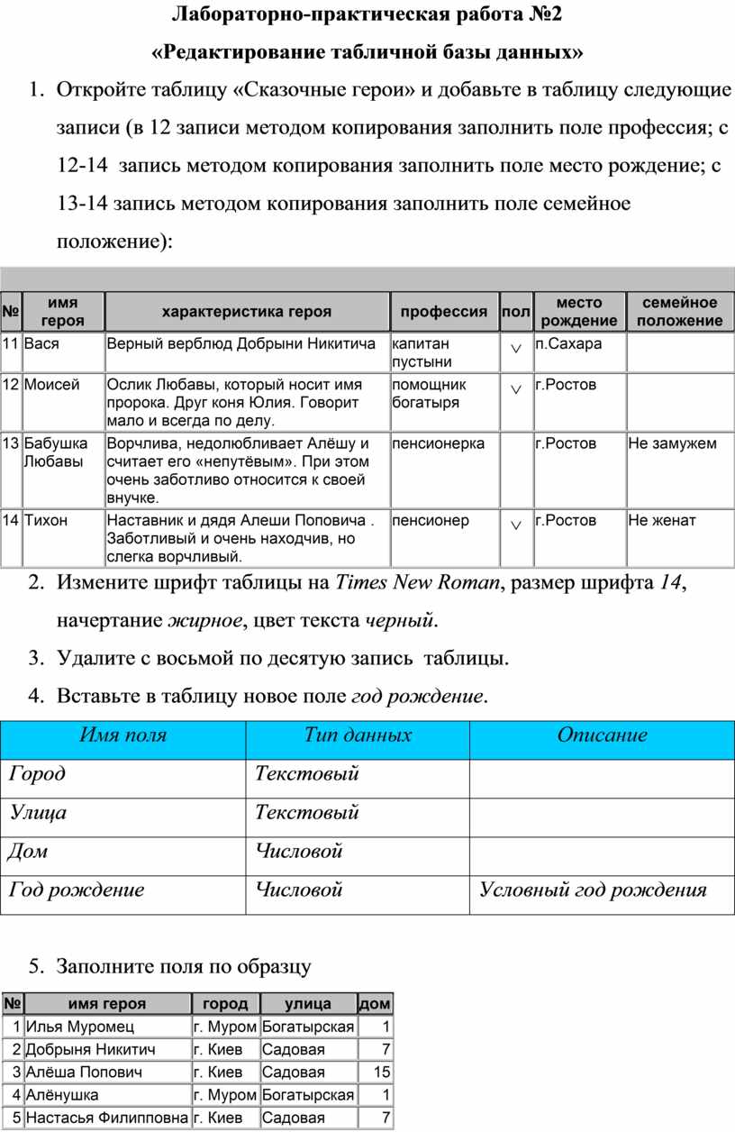 1. Откройте таблицу «Сказочные герои» и добавьте в таблицу следующие записи (в 12 записи методом копирования заполнить поле профессия; с 12-14 запись методом копирования заполнить поле место рождение; с 13-14 запись методом копирования заполнить поле семейное положение):