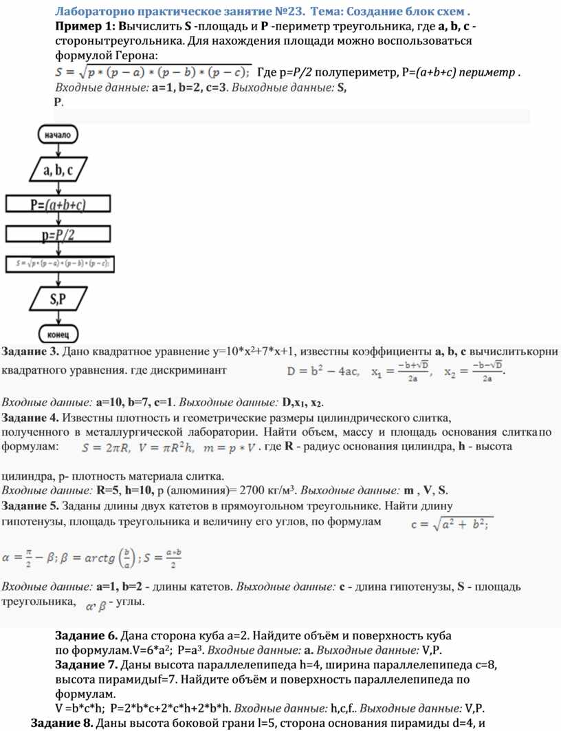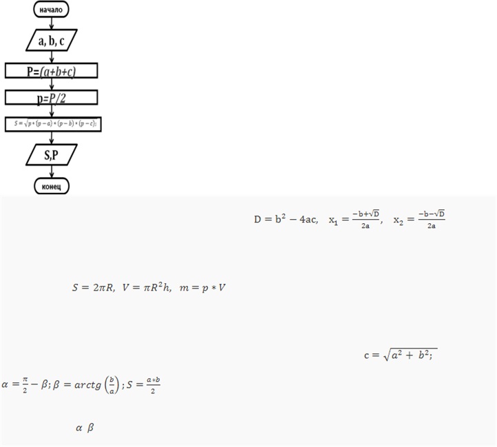 Пример 1: Вычислить S -площадь и P -периметр треугольника, где a, b, c - стороны треугольника. Для нахождения площади можно воспользоваться формулой Герона: