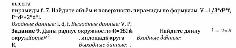 Входные данные: l, d, f. Выходные данные: V, Р.