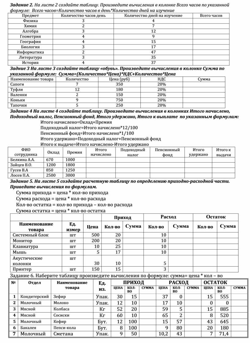 Задание 6. Наберите таблицу произведите вычисления по формуле: сумма= цена * кол – во