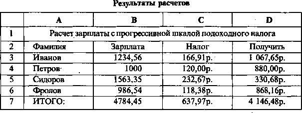 формулу=ЕСЛИ(ВЗ<=1000;ВЗ*0,12;1000*0,12+(ВЗ-1000)*0,2). В этой формуле проверяется условиеВ3<=1000. Если условие соблюдается, то налог вычисляется по формуле В3*0,12. Если условие ложно, то налог вычисляется по формуле 1000*0,12+(ВЗ-1000)*0,2 (12% от суммы зарплаты в 1000 рублей + 20% от суммы, превышающей 1000 рублей).