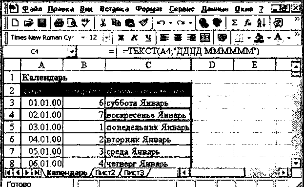 6. В ячейку СЗ ввести формулу =ТЕКСТ(АЗ; «ДДДД МММММM»), которая по дате определит текстовое название дня недели и месяца. Скопировать формулу из СЗ в диапазон С4:С39. В столбце С будут выведены названия дней недели и месяцев за весь год.