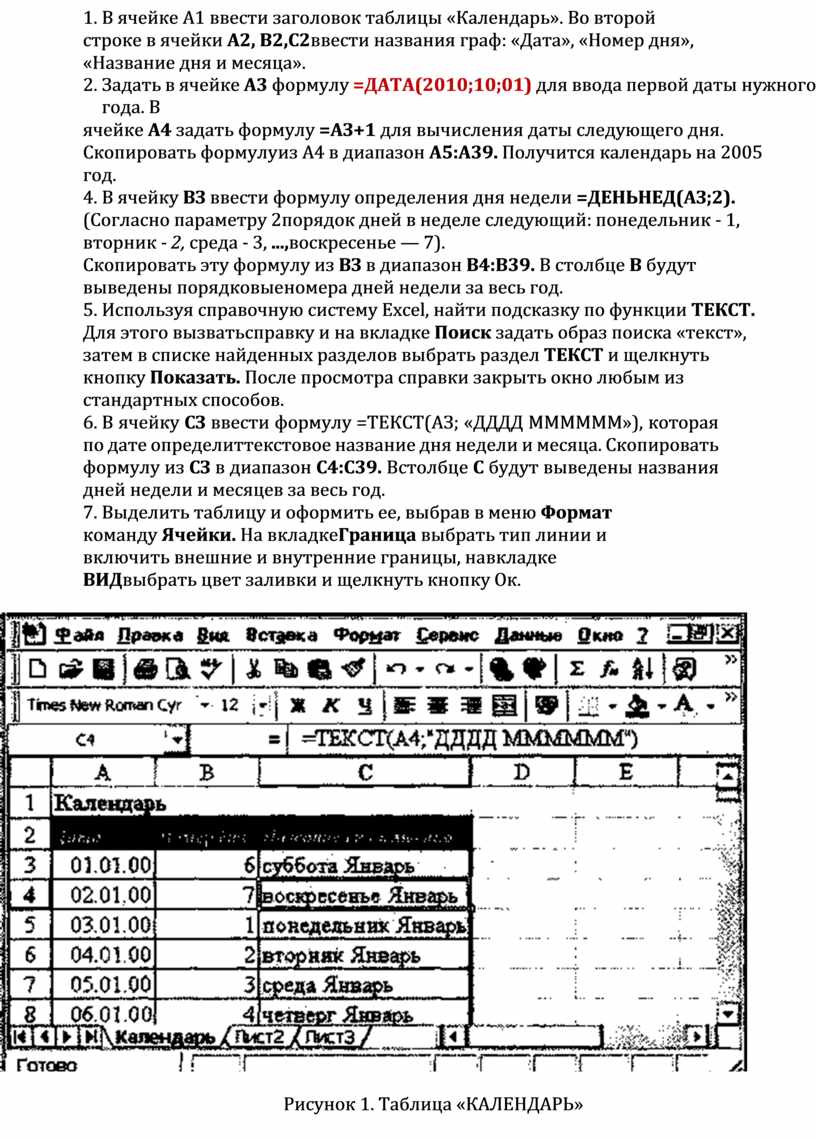 3. В ячейке А1 ввести заголовок таблицы «Календарь». Во второй строке в ячейки А2, В2, С2ввести названия граф: «Дата», «Номер дня», «Название дня и месяца».
