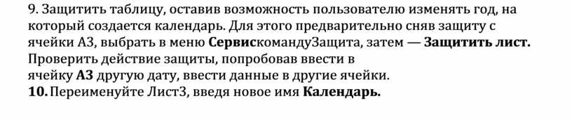 9. Защитить таблицу, оставив возможность пользователю изменять год, на который создается календарь. Для этого предварительно сняв защиту с ячейки A3, выбрать в меню Сервискоманду Защита, затем — Защитить лист. Проверить действие защиты, попробовав ввести в