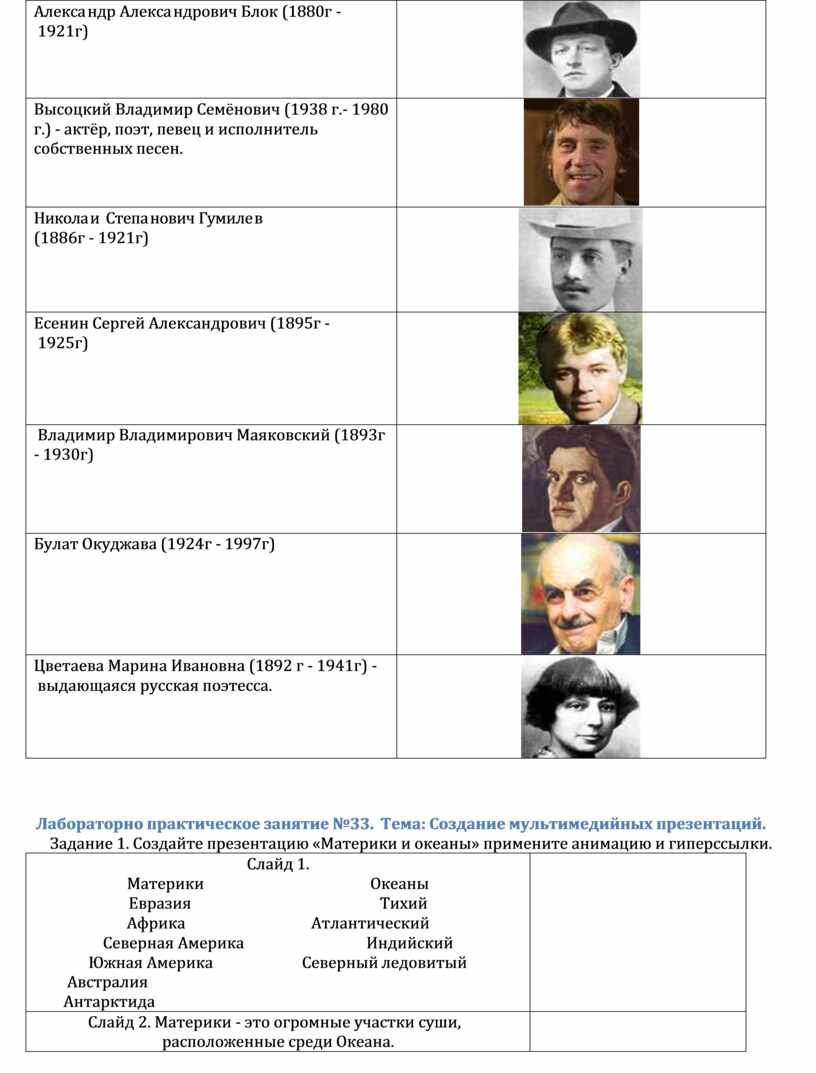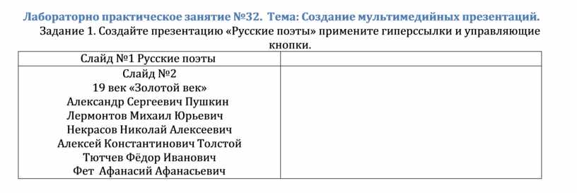 Задание 1. Создайте презентацию «Русские поэты» примените гиперссылки и управляющие кнопки.