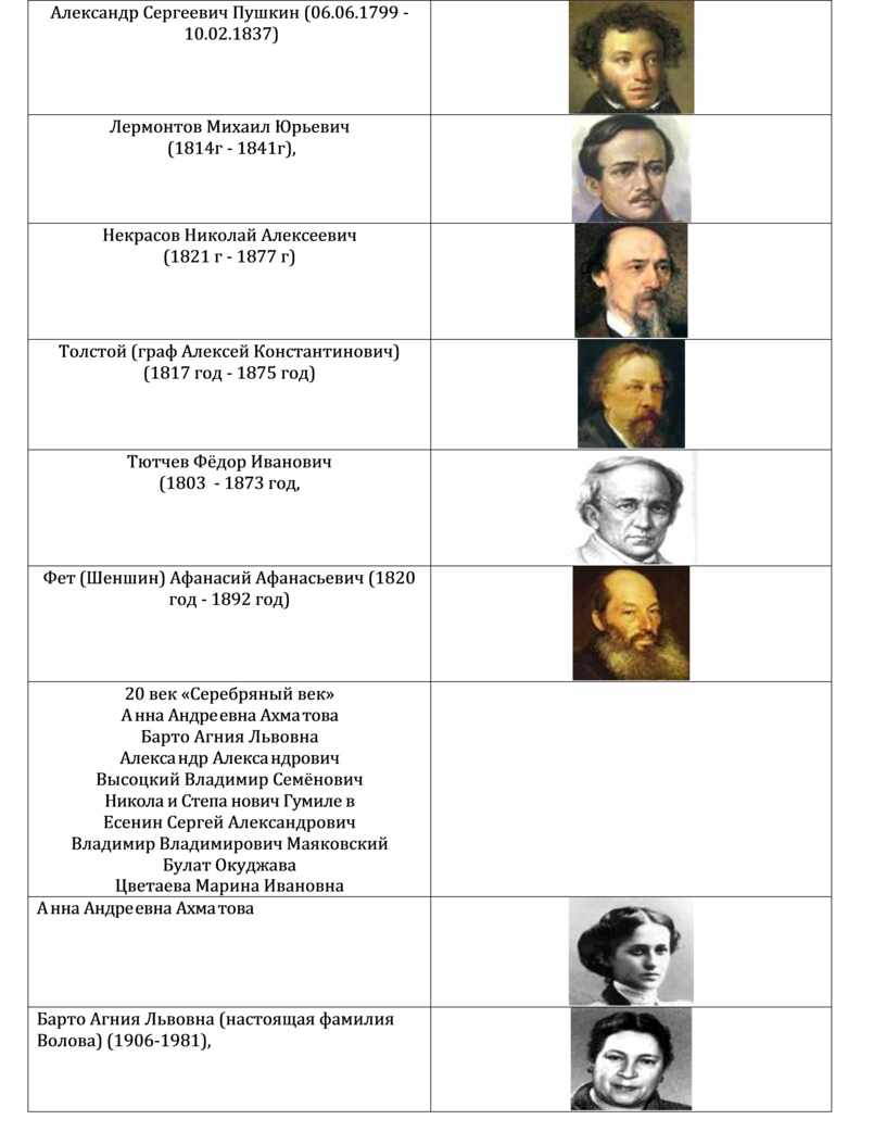 20 век «Серебряный век» А нна Андре евна Ахма това Барто Агния Львовна Алекса ндр Алекса ндрович Высоцкий Владимир Семёнович Никола и Степа нович Гумиле в Есенин Сергей Александрович Владимир Владимирович Маяковский Булат Окуджава Цветаева Марина Ивановна |