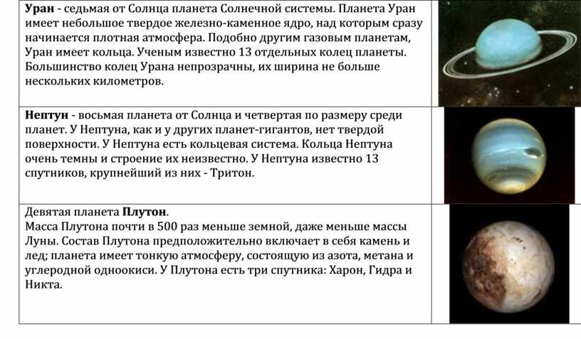 Девятая планета Плутон. Масса Плутона почти в 500 раз меньше земной, даже меньше массы Луны. Состав Плутона предположительно включает в себя камень и лед; планета имеет тонкую атмосферу, состоящую из азота, метана и углеродной одноокиси. У Плутона есть три спутника: Харон, Гидра и Никта. |