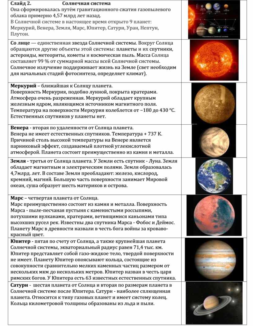 Слайд 2. Солнечная система Она сформировалась путём гравитационного сжатия газопылевого облака примерно 4,57 млрд лет назад. В Солнечной системе в настоящее время открыто 9 планет: Меркурий, Венера, Земля, Марс, Юпитер, Сатурн, Уран, Нептун, Плутон. |