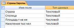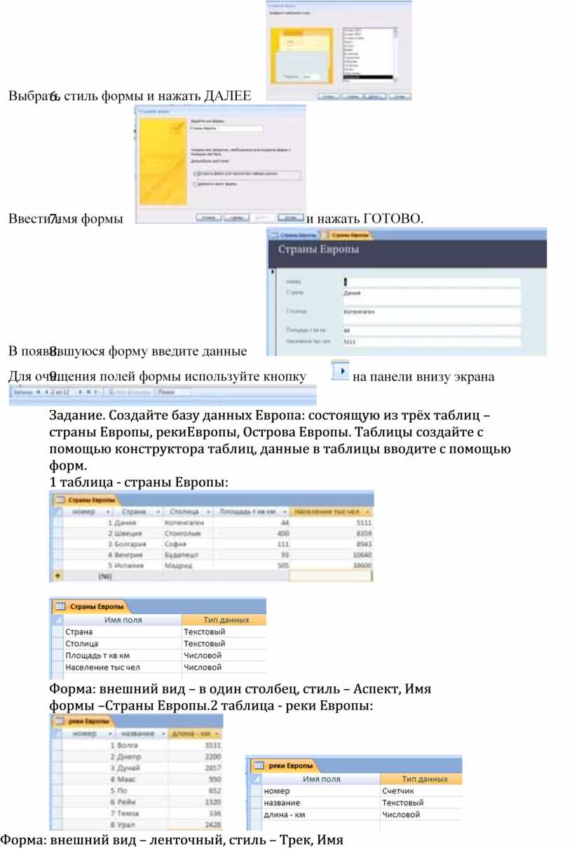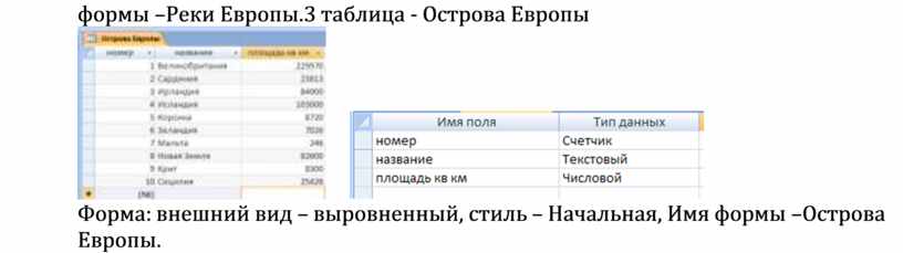 Задание. Создайте базу данных Европа: состоящую из трёх таблиц – страны Европы, реки Европы, Острова Европы. Таблицы создайте с помощью конструктора таблиц, данные в таблицы вводите с помощью форм.