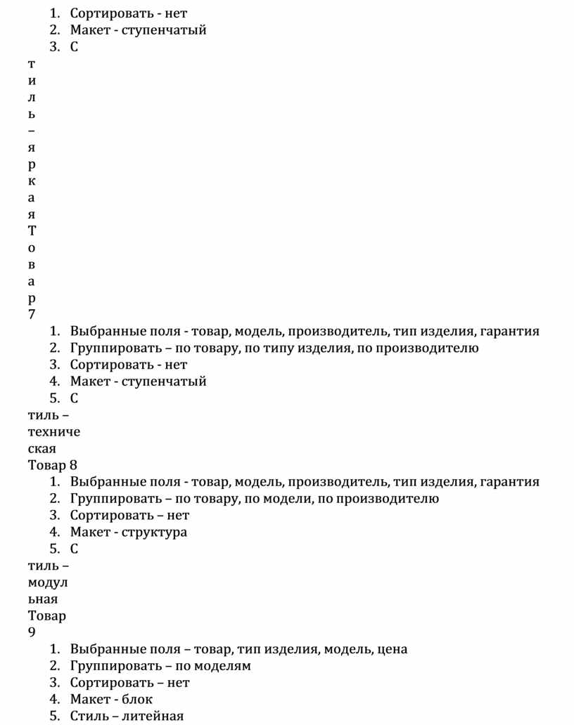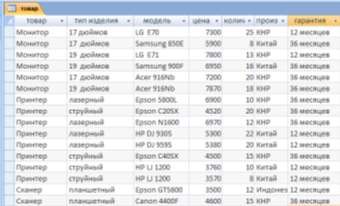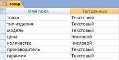 1. Выбранные поля – товар, тип изделия, модель, цена