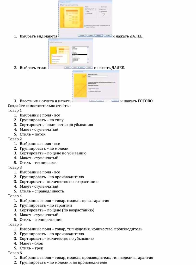 выровненный, стиль – Начальная, Имя формы – Товар. Для этой таблицы создайте отчёты.