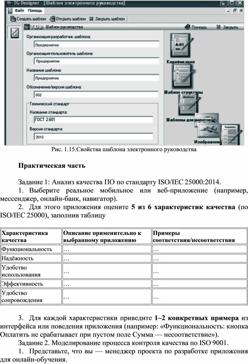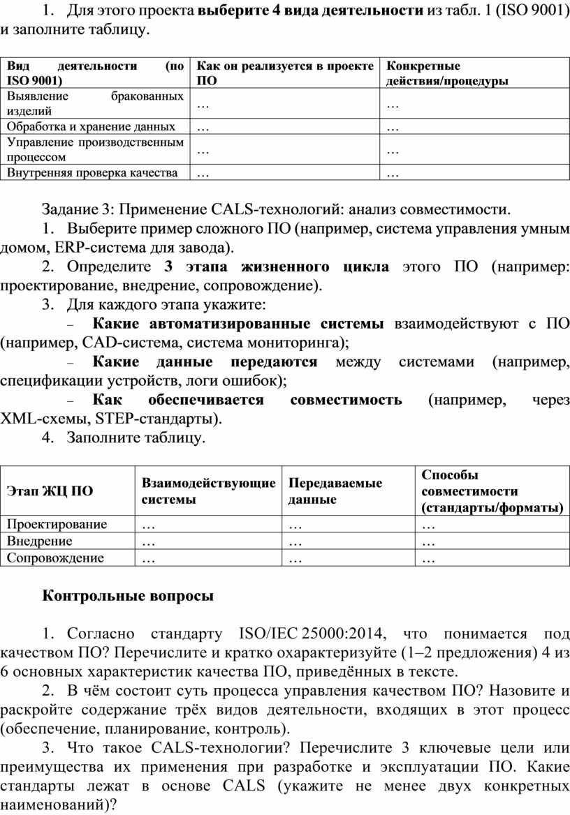 Цель: Отработать классификацию характеристик качества ПО на конкретном примере, научиться соотносить виды деятельности по управлению качеством с элементами стандарта ISO 9001. Понять, как CALS‑технологии обеспечивают совместимость ПО на разных этапах жизненного цикла.