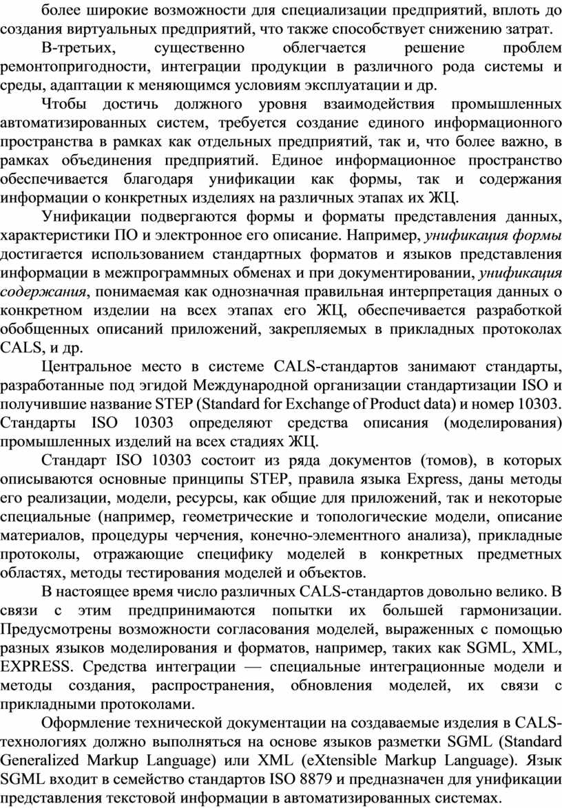 Оформление технической документации на создаваемые изделия в CALS-технологиях должно выполняться на основе языков разметки SGML (Standard Generalized Markup Language) или XML (eXtensible Markup Language). Язык SGML входит в семейство стандартов ISO 8879 и предназначен для унификации представления текстовой информации в автоматизированных системах.
