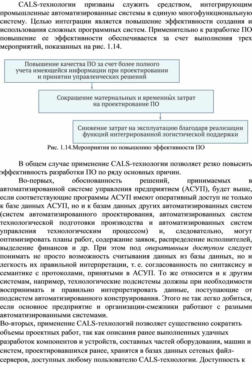 CALS-технологии призваны служить средством, интегрирующим промышленные автоматизированные системы в единую многофункциональную систему. Целью интеграции является повышение эффективности создания и использования сложных программных систем. Применительно к разработке ПО повышение ее эффективности обеспечивается за счет выполнения трех мероприятий, показанных на рис. 1.14.