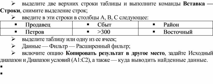Ø включите опцию Копировать результат в другое место, задайте Исходный диапазон и Диапазон условий (А1:С2), а также — куда выводить найденные данные.