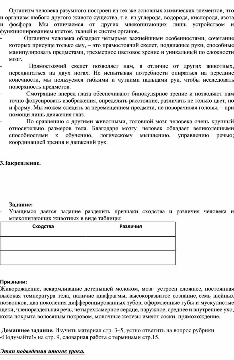 - Учащимся дается задание разделить признаки сходства и различия человека и млекопитающих животных в виде таблицы:
