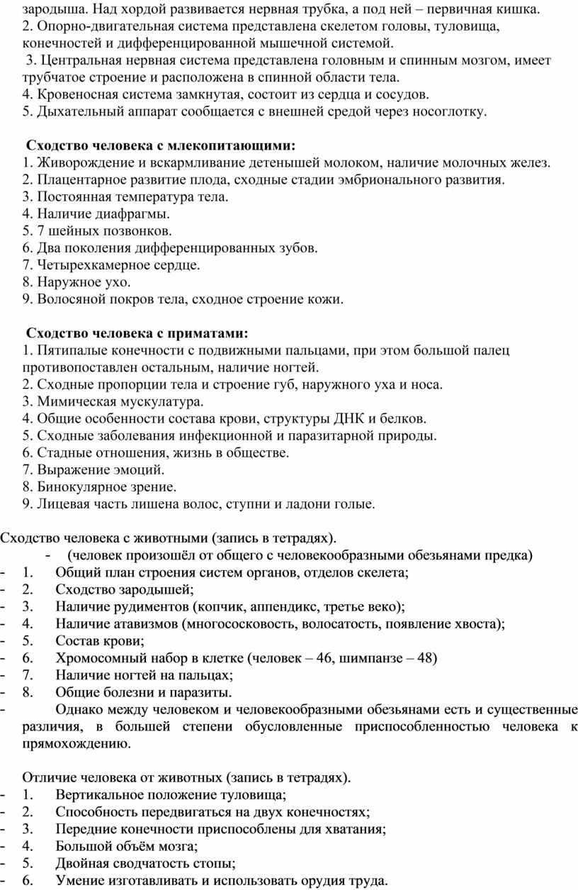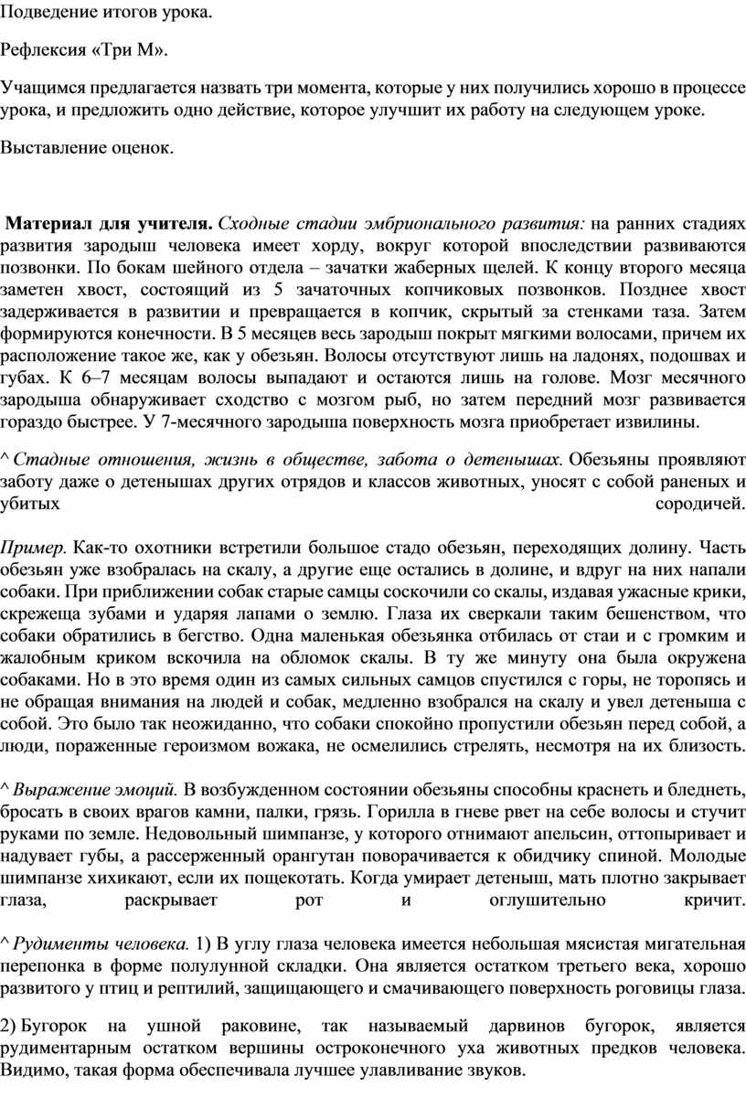 Материал для учителя. Сходные стадии эмбрионального развития: на ранних стадиях развития зародыш человека имеет хорду, вокруг которой впоследствии развиваются позвонки. По бокам шейного отдела – зачатки жаберных щелей. К концу второго месяца заметен хвост, состоящий из 5 зачаточных копчиковых позвонков. Позднее хвост задерживается в развитии и превращается в копчик, скрытый за стенками таза. Затем формируются конечности. В 5 месяцев весь зародыш покрыт мягкими волосами, причем их расположение такое же, как у обезьян. Волосы отсутствуют лишь на ладонях, подошвах и губах. К 6–7 месяцам волосы выпадают и остаются лишь на голове. Мозг месячного зародыша обнаруживает сходство с мозгом рыб, но затем передний мозг развивается гораздо быстрее. У 7-месячного зародыша поверхность мозга приобретает извилины.