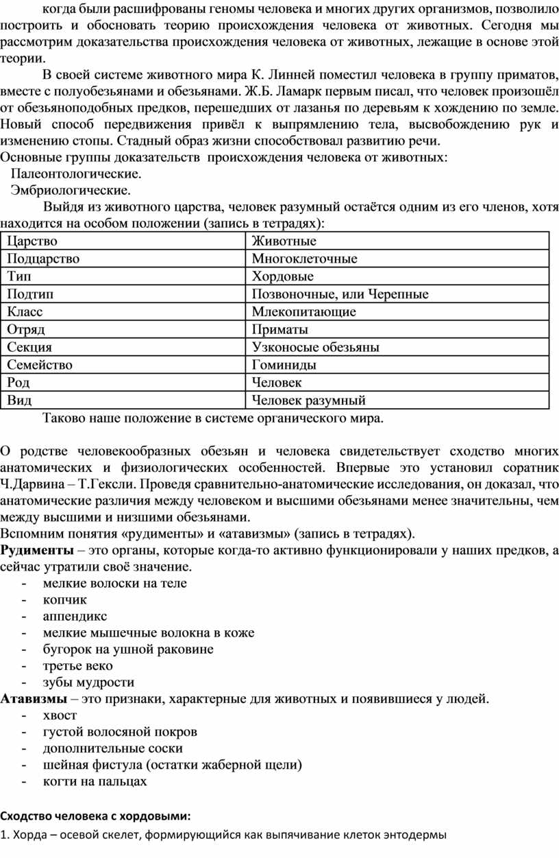 Каково же происхождение человека, как он появился на Земле? По этому поводу существует множество мнений. (Учащиеся высказывают известные им версии происхождения человека). Накопление научных данных, особенно в последние годы, когда были расшифрованы геномы человека и многих других организмов, позволило построить и обосновать теорию происхождения человека от животных. Сегодня мы рассмотрим доказательства происхождения человека от животных, лежащие в основе этой теории.