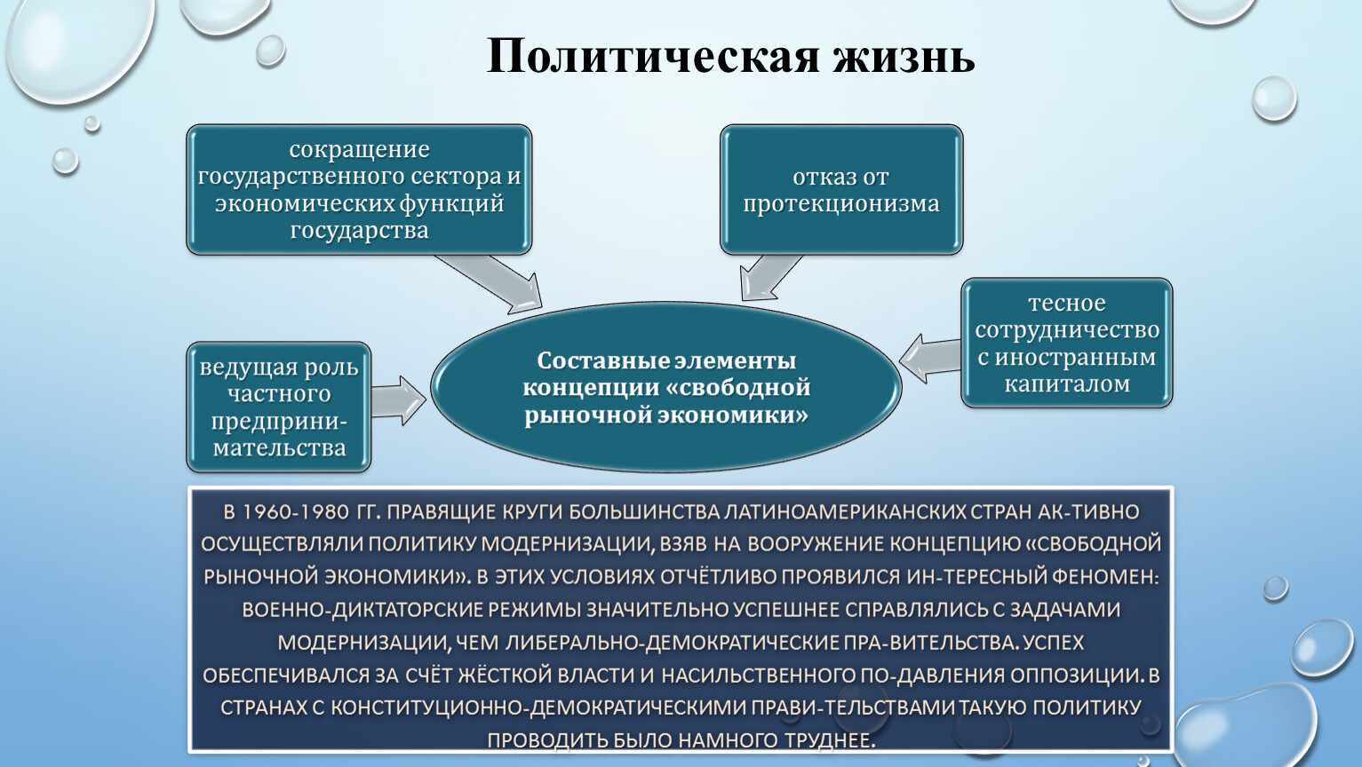В 1960-1980 гг. правящие круги большинства латиноамериканских стран ак-тивно осуществляли политику модернизации, взяв на вооружение концепцию «свободной рыночной экономики». В этих условиях отчётливо проявился ин-тересный феномен: военно-диктаторские режимы значительно успешнее справлялись с задачами модернизации, чем либерально-демократические пра-вительства. Успех обеспечивался за счёт жёсткой власти и насильственного по-давления оппозиции. В странах с конституционно-демократическими прави-тельствами такую политику проводить было намного труднее.