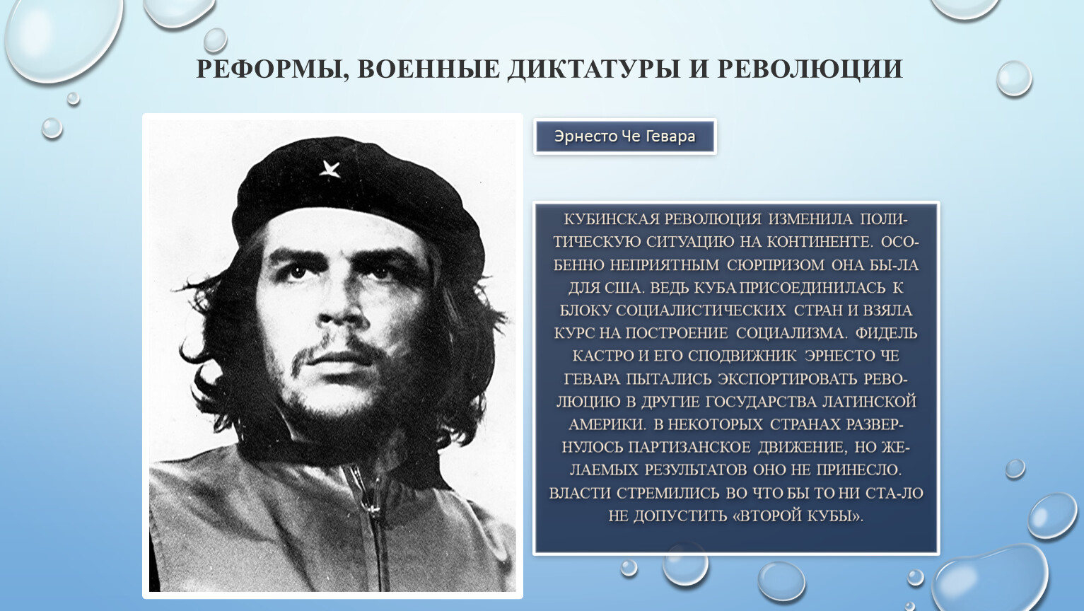 Кубинская революция изменила поли-тическую ситуацию на континенте. Осо-бенно неприятным сюрпризом она бы-ла для США. Ведь Куба присоединилась к блоку социалистических стран и взяла курс на построение социализма. Фидель Кастро и его сподвижник Эрнесто Че Гевара пытались экспортировать рево-люцию в другие государства Латинской Америки. В некоторых странах развер-нулось партизанское движение, но же-лаемых результатов оно не принесло. Власти стремились во что бы то ни ста-ло не допустить «второй Кубы».
