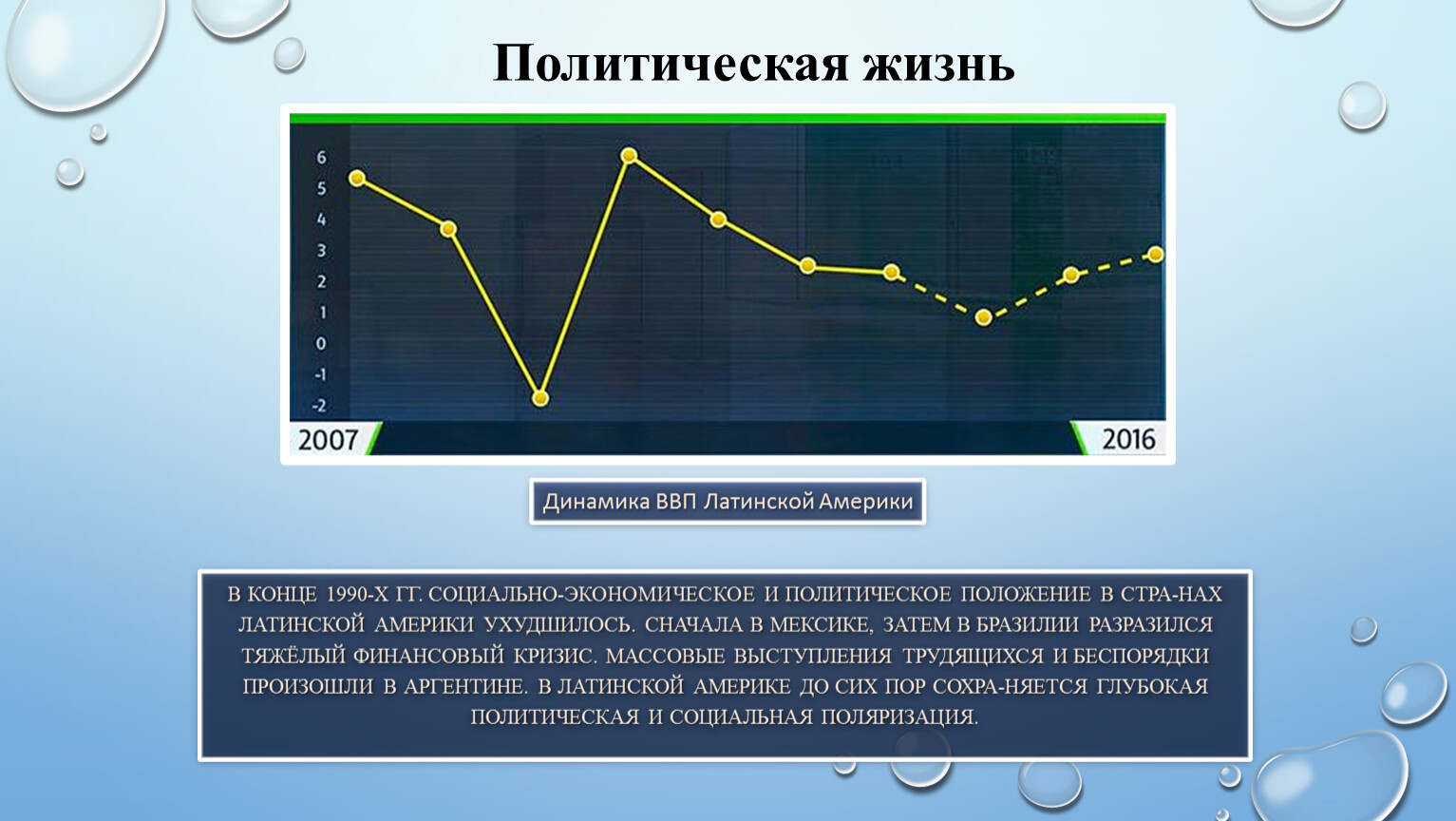 В конце 1990-х гг. социально-экономическое и политическое положение в стра-нах Латинской Америки ухудшилось. Сначала в Мексике, затем в Бразилии разразился тяжёлый финансовый кризис. Массовые выступления трудящихся и беспорядки произошли в Аргентине. В Латинской Америке до сих пор сохра-няется глубокая политическая и социальная поляризация.
