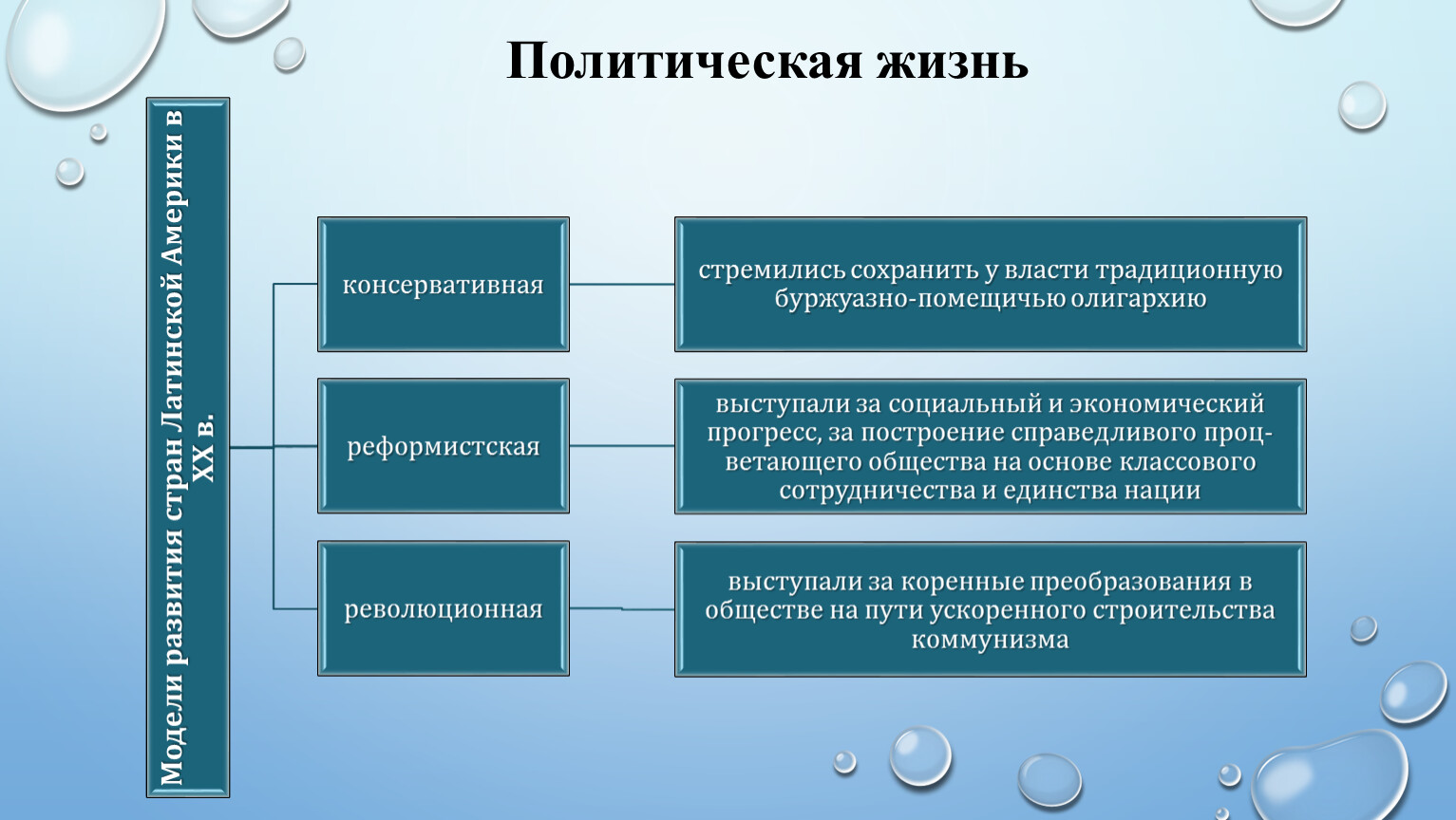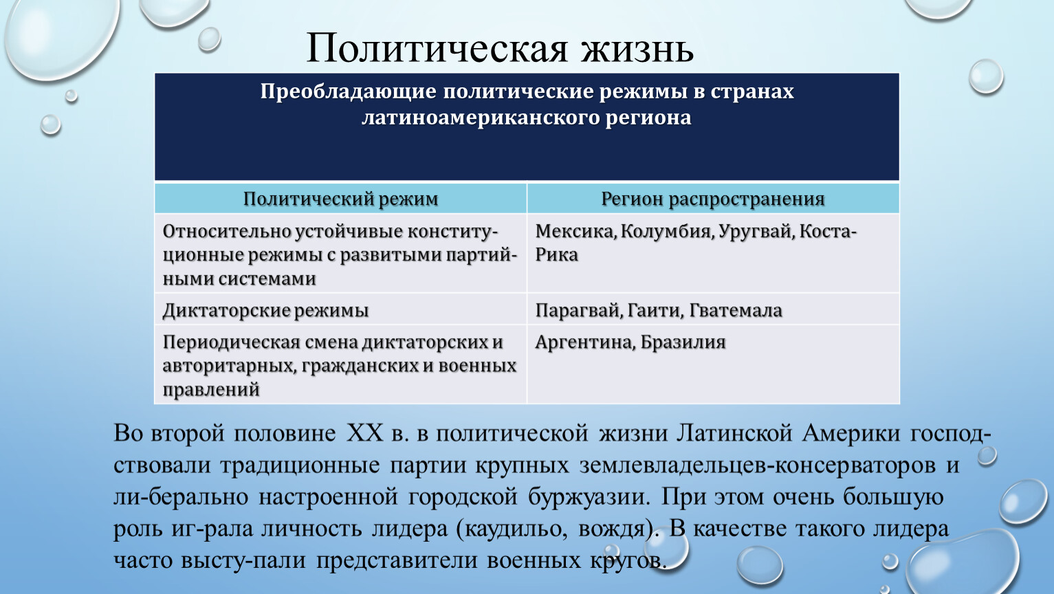 Во второй половине ХХ в. в политической жизни Латинской Америки господ-ствовали традиционные партии крупных землевладельцев-консерваторов и ли-берально настроенной городской буржуазии. При этом очень большую роль иг-рала личность лидера (каудильо, вождя). В качестве такого лидера часто высту-пали представители военных кругов.