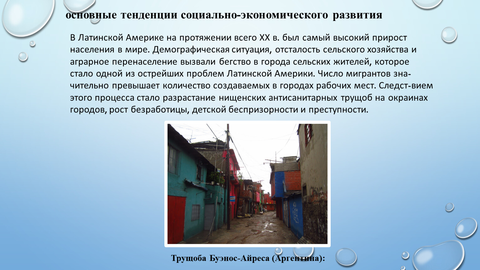 В Латинской Америке на протяжении всего ХХ в. был самый высокий прирост населения в мире. Демографическая ситуация, отсталость сельского хозяйства и аграрное перенаселение вызвали бегство в города сельских жителей, которое стало одной из острейших проблем Латинской Америки. Число мигрантов зна-чительно превышает количество создаваемых в городах рабочих мест. Следст-вием этого процесса стало разрастание нищенских антисанитарных трущоб на окраинах городов, рост безработицы, детской беспризорности и преступности.