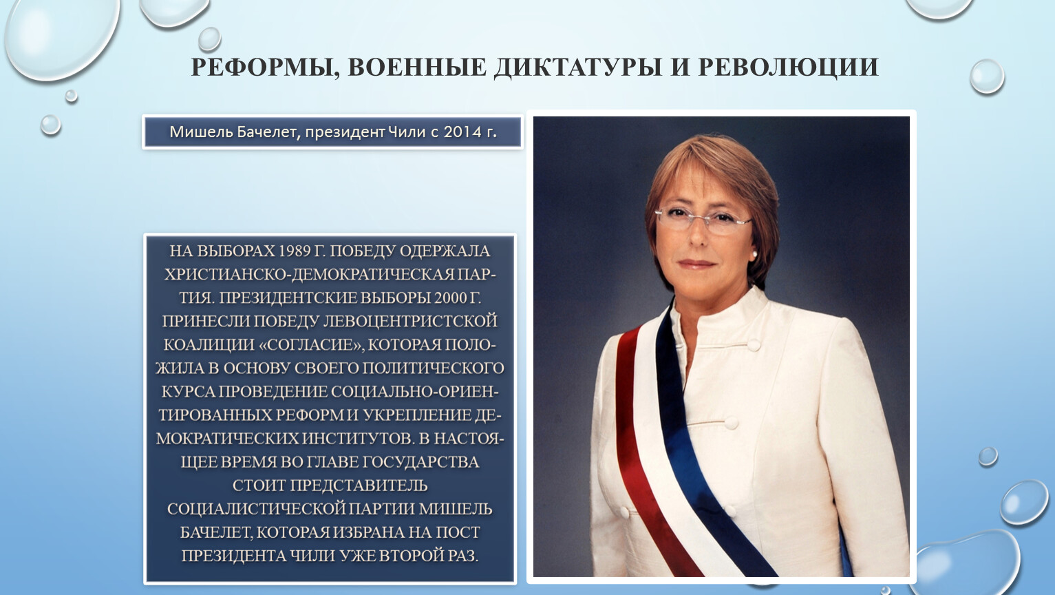 На выборах 1989 г. победу одержала Христианско-демократическая пар-тия. Президентские выборы 2000 г. принесли победу левоцентристской коалиции «Согласие», которая поло-жила в основу своего политического курса проведение социально-ориен-тированных реформ и укрепление де-мократических институтов. В настоя-щее время во главе государства стоит представитель Социалистической партии Мишель Бачелет, которая избрана на пост президента Чили уже второй раз.