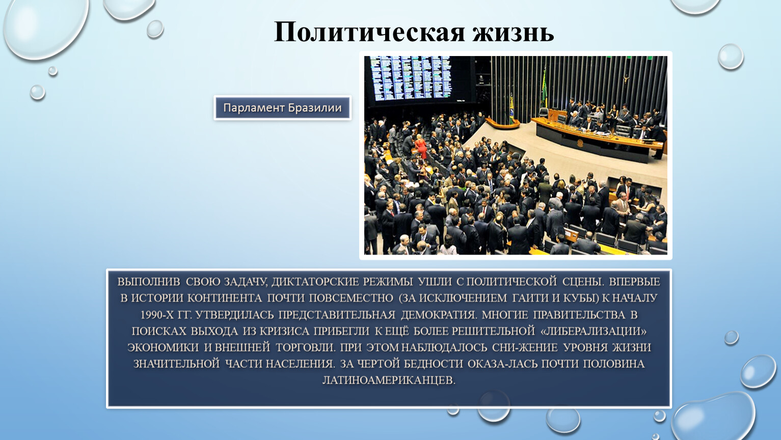 Выполнив свою задачу, диктаторские режимы ушли с политической сцены. Впервые в истории континента почти повсеместно (за исключением Гаити и Кубы) к началу 1990-х гг. утвердилась представительная демократия. Многие правительства в поисках выхода из кризиса прибегли к ещё более решительной «либерализации» экономики и внешней торговли. При этом наблюдалось сни-жение уровня жизни значительной части населения. За чертой бедности оказа-лась почти половина латиноамериканцев.
