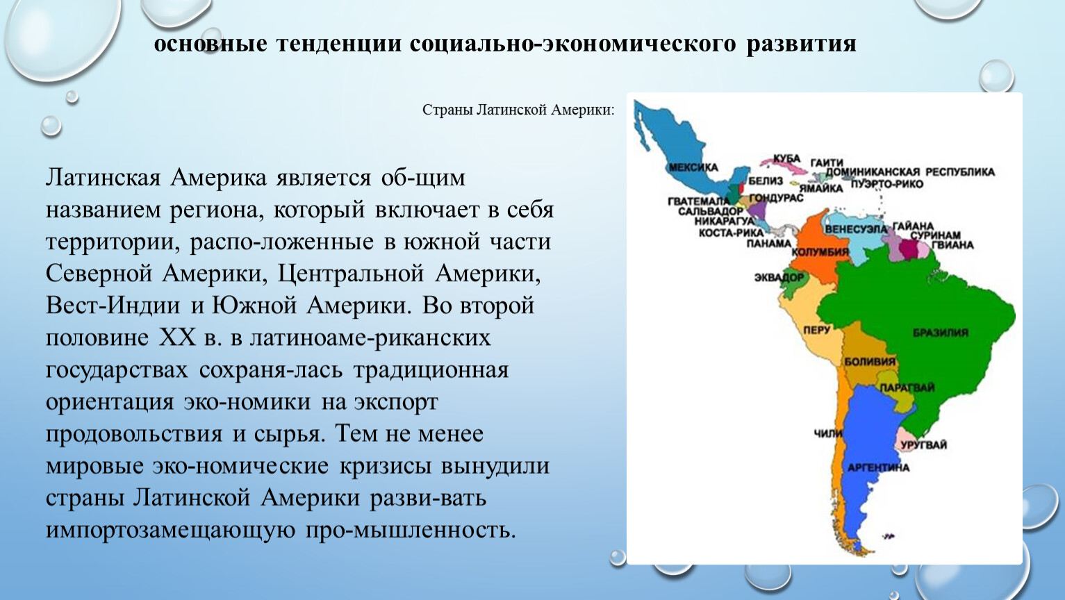 Латинская Америка является об-щим названием региона, который включает в себя территории, распо-ложенные в южной части Северной Америки, Центральной Америки, Вест-Индии и Южной Америки. Во второй половине ХХ в. в латиноаме-риканских государствах сохраня-лась традиционная ориентация эко-номики на экспорт продовольствия и сырья. Тем не менее мировые эко-номические кризисы вынудили страны Латинской Америки разви-вать импортозамещающую про-мышленность.