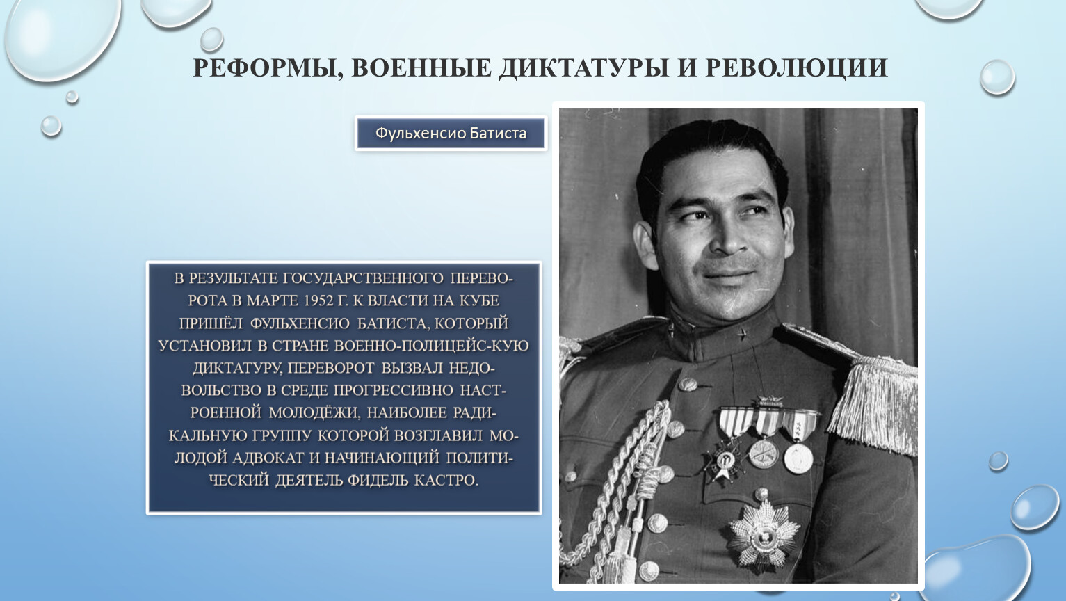 В результате государственного перево-рота в марте 1952 г. к власти на Кубе пришёл Фульхенсио Батиста, который установил в стране военно-полицейс-кую диктатуру, Переворот вызвал недо-вольство в среде прогрессивно наст-роенной молодёжи, наиболее ради-кальную группу которой возглавил мо-лодой адвокат и начинающий полити-ческий деятель Фидель Кастро.