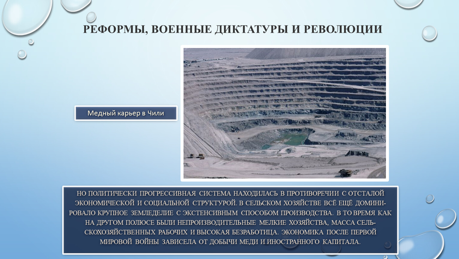 Но политически прогрессивная система находилась в противоречии с отсталой экономической и социальной структурой. В сельском хозяйстве всё ещё домини-ровало крупное земледелие с экстенсивным способом производства. В то время как на другом полюсе были непроизводительные мелкие хозяйства, масса сель-скохозяйственных рабочих и высокая безработица. Экономика после Первой мировой войны зависела от добычи меди и иностранного капитала.