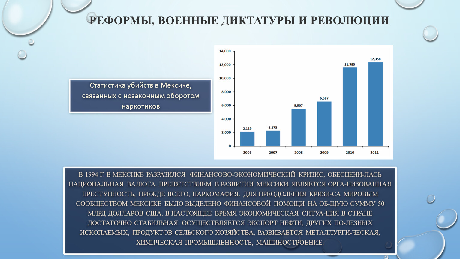 В 1994 г. в Мексике разразился финансово-экономический кризис, обесцени-лась национальная валюта. Препятствием в развитии Мексики является орга-низованная преступность, прежде всего, наркомафия. Для преодоления кризи-са мировым сообществом Мексике было выделено финансовой помощи на об-щую сумму 50 млрд долларов США. В настоящее время экономическая ситуа-ция в стране достаточно стабильная. Осуществляется экспорт нефти, других по-лезных ископаемых, продуктов сельского хозяйства, развивается металлурги-ческая, химическая промышленность, машиностроение.