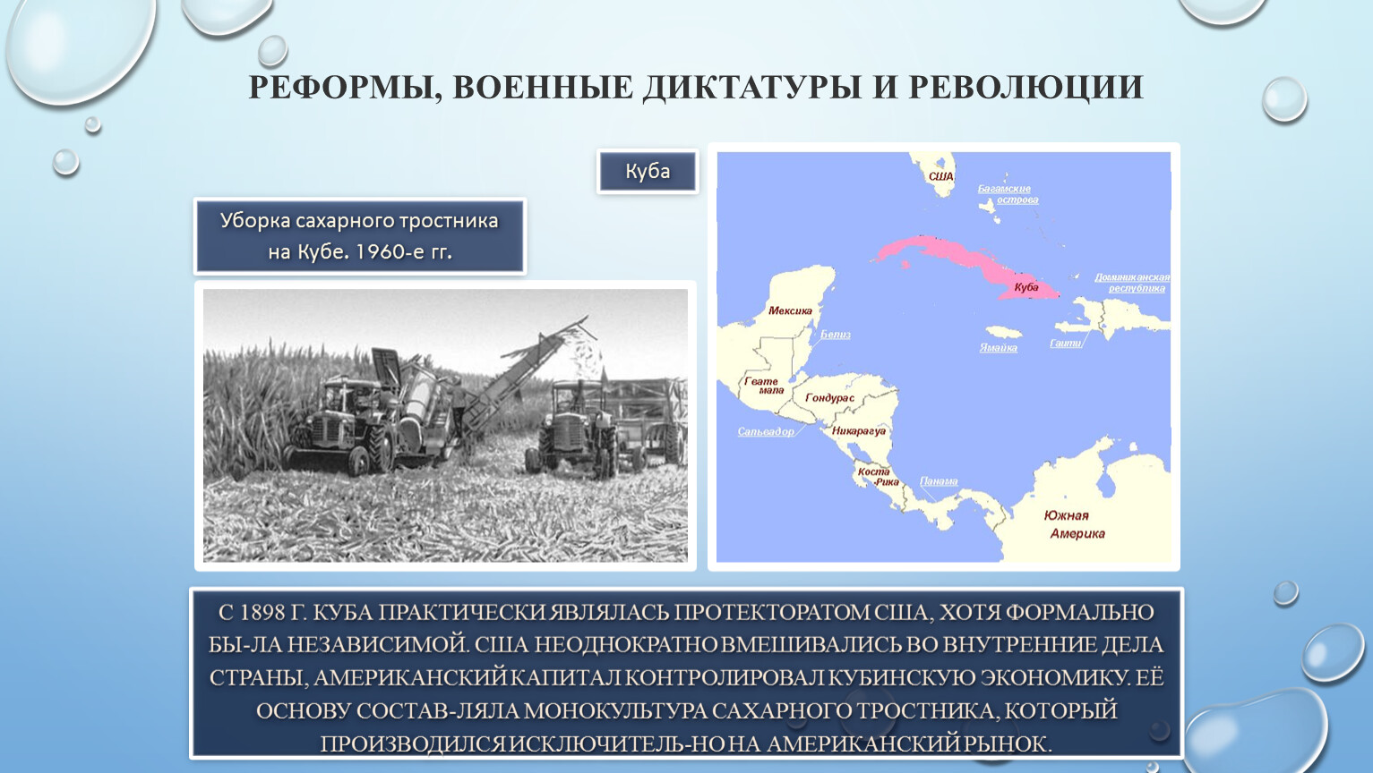 С 1898 г. Куба практически являлась протекторатом США, хотя формально бы-ла независимой. США неоднократно вмешивались во внутренние дела страны, американский капитал контролировал кубинскую экономику. Её основу состав-ляла монокультура сахарного тростника, который производился исключитель-но на американский рынок.