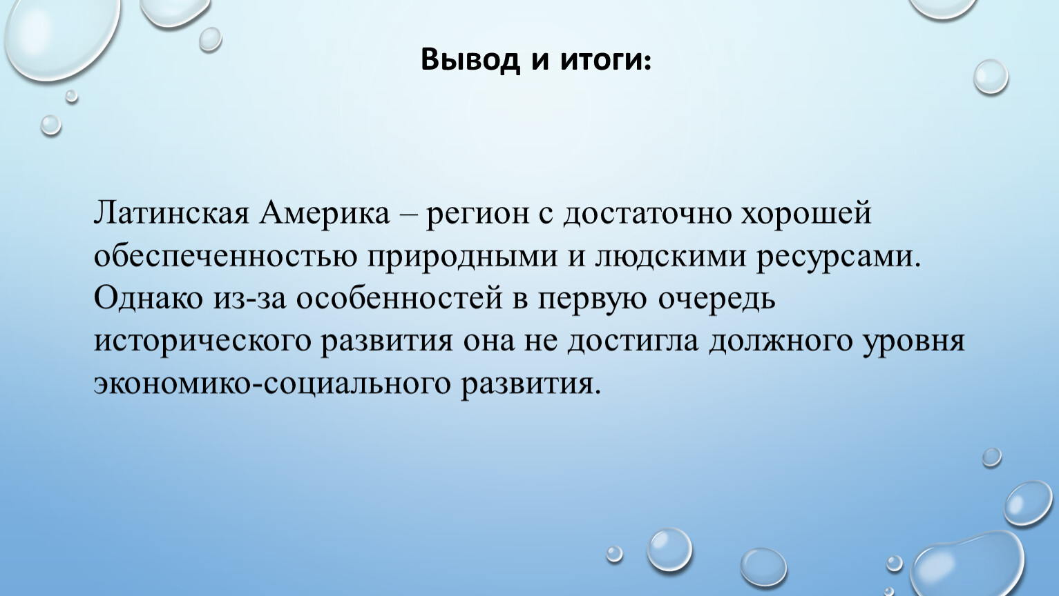 Латинская Америка – регион с достаточно хорошей обеспеченностью природными и людскими ресурсами. Однако из-за особенностей в первую очередь исторического развития она не достигла должного уровня экономико-социального развития.