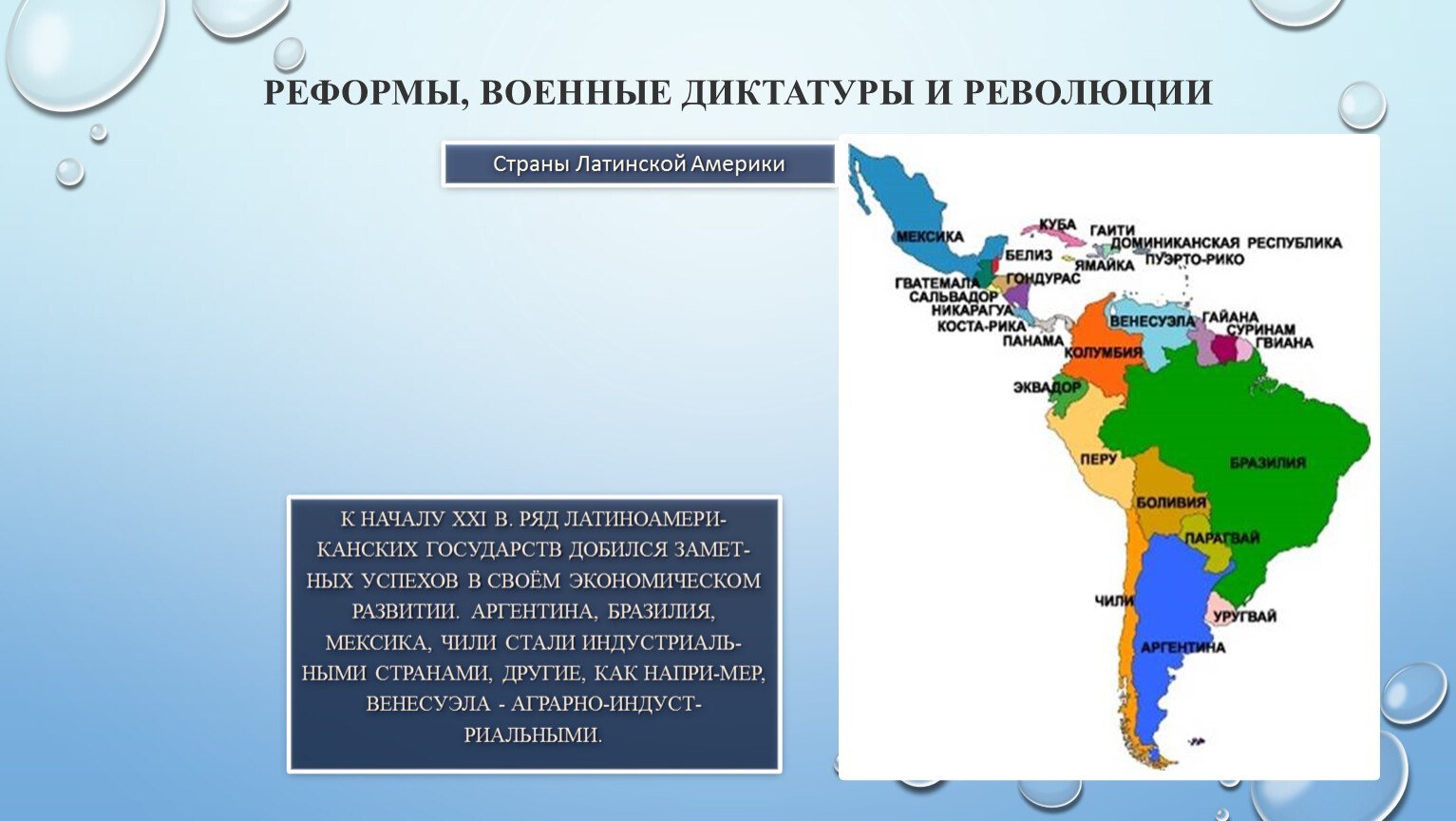 К началу XXI в. ряд латиноамери-канских государств добился замет-ных успехов в своём экономическом развитии. Аргентина, Бразилия, Мексика, Чили стали индустриаль-ными странами, другие, как напри-мер, Венесуэла - аграрно-индуст-риальными.