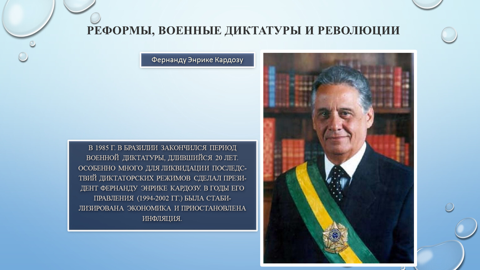 В 1985 г. в Бразилии закончился период военной диктатуры, длившийся 20 лет. Особенно много для ликвидации последс-твий диктаторских режимов сделал прези-дент Фернанду Энрике Кардозу. В годы его правления (1994-2002 гг.) была стаби-лизирована экономика и приостановлена инфляция.