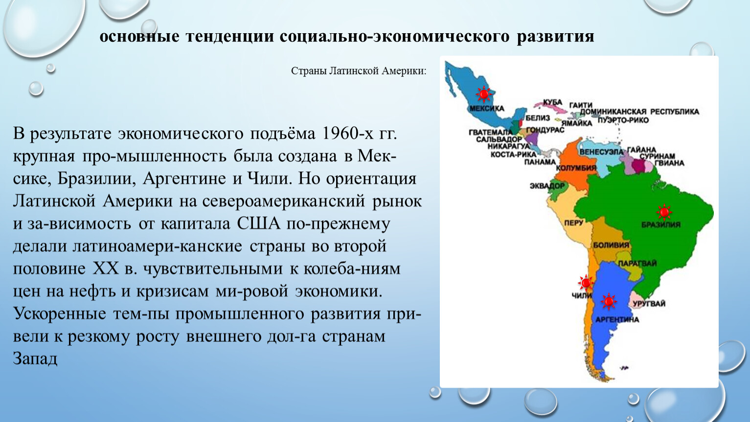 В результате экономического подъёма 1960-х гг. крупная про-мышленность была создана в Мек-сике, Бразилии, Аргентине и Чили. Но ориентация Латинской Америки на североамериканский рынок и за-висимость от капитала США по-прежнему делали латиноамери-канские страны во второй половине ХХ в. чувствительными к колеба-ниям цен на нефть и кризисам ми-ровой экономики. Ускоренные тем-пы промышленного развития при-вели к резкому росту внешнего дол-га странам Запад