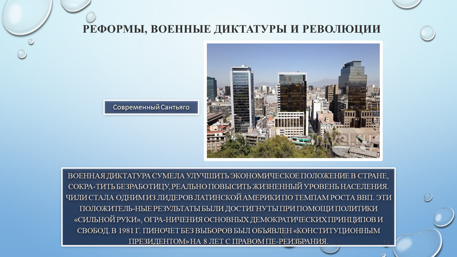Военная диктатура сумела улучшить экономическое положение в стране, сокра-тить безработицу, реально повысить жизненный уровень населения. Чили стала одним из лидеров Латинской Америки по темпам роста ВВП. Эти положитель-ные результаты были достигнуты при помощи политики «сильной руки», огра-ничения основных демократических принципов и свобод. В 1981 г. Пиночет без выборов был объявлен «конституционным президентом» на 8 лет с правом пе-реизбрания.