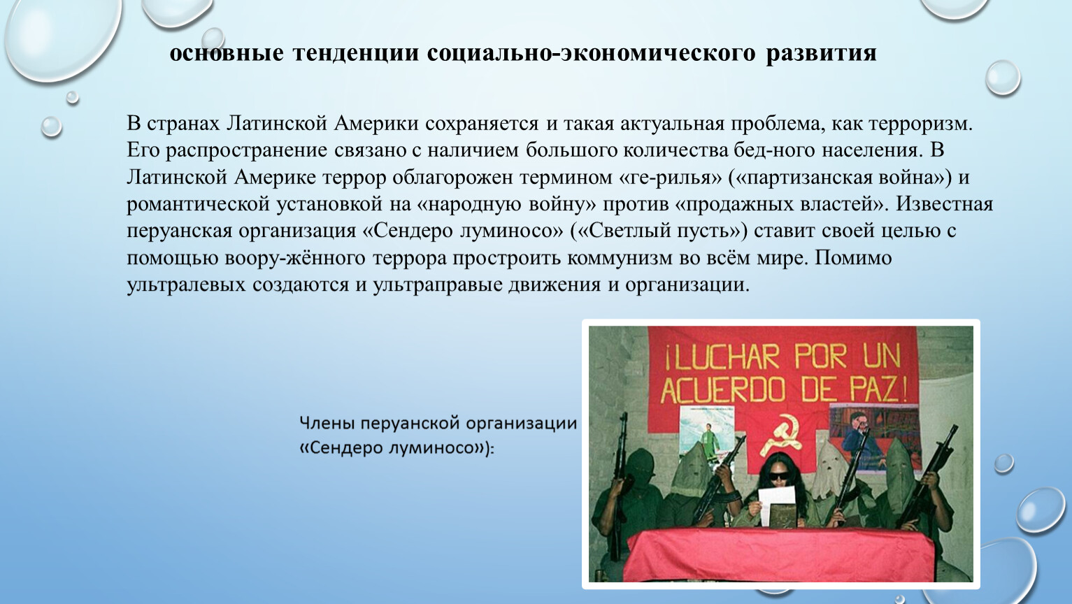 В странах Латинской Америки сохраняется и такая актуальная проблема, как терроризм. Его распространение связано с наличием большого количества бед-ного населения. В Латинской Америке террор облагорожен термином «ге-рилья» («партизанская война») и романтической установкой на «народную войну» против «продажных властей». Известная перуанская организация «Сендеро луминосо» («Светлый пусть») ставит своей целью с помощью воору-жённого террора простроить коммунизм во всём мире. Помимо ультралевых создаются и ультраправые движения и организации.