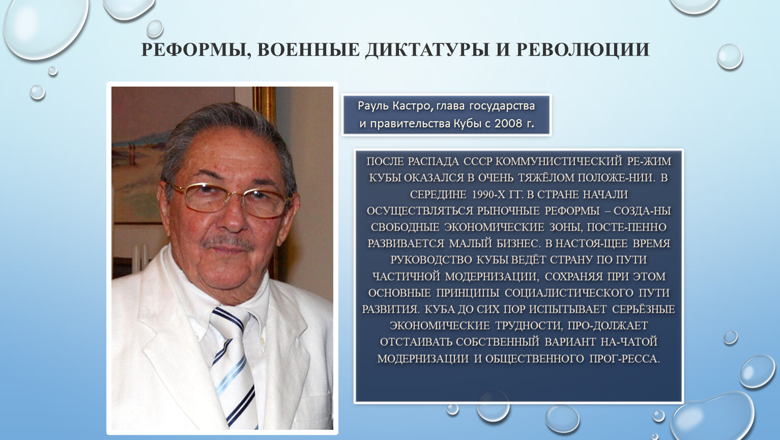 После распада СССР коммунистический ре-жим Кубы оказался в очень тяжёлом положе-нии. В середине 1990-х гг. в стране начали осуществляться рыночные реформы – созда-ны свободные экономические зоны, посте-пенно развивается малый бизнес. В настоя-щее время руководство Кубы ведёт страну по пути частичной модернизации, сохраняя при этом основные принципы социалистического пути развития. Куба до сих пор испытывает серьёзные экономические трудности, про-должает отстаивать собственный вариант на-чатой модернизации и общественного прог-ресса.