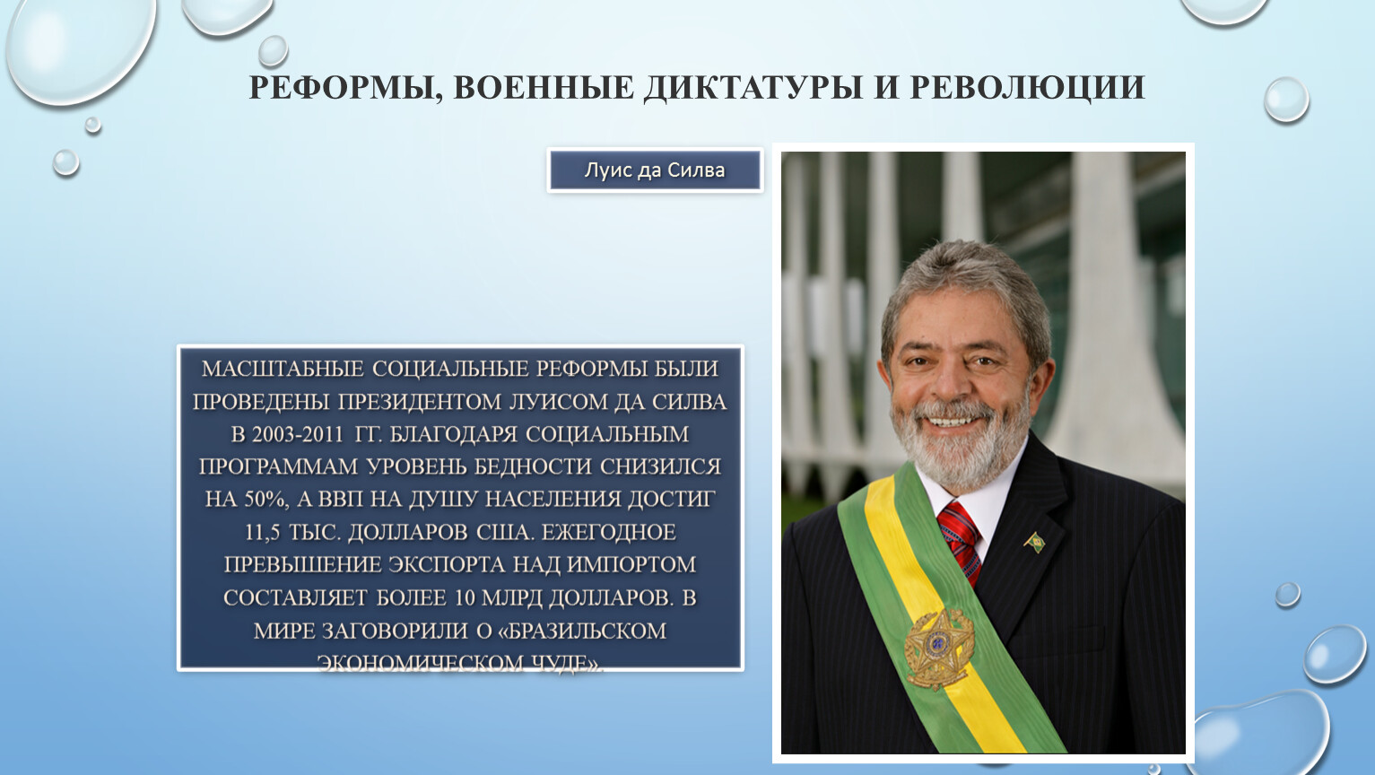 Масштабные социальные реформы были проведены президентом Луисом да Силва в 2003-2011 гг. Благодаря социальным программам уровень бедности снизился на 50%, а ВВП на душу населения достиг 11,5 тыс. долларов США. Ежегодное превышение экспорта над импортом составляет более 10 млрд долларов. В мире заговорили о «бразильском экономическом чуде».