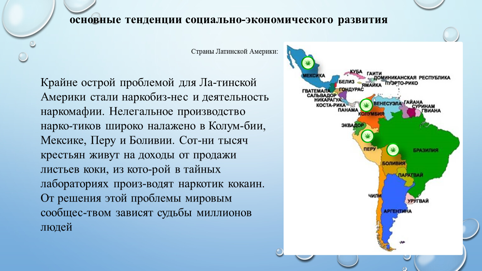 Крайне острой проблемой для Ла-тинской Америки стали наркобиз-нес и деятельность наркомафии. Нелегальное производство нарко-тиков широко налажено в Колум-бии, Мексике, Перу и Боливии. Сот-ни тысяч крестьян живут на доходы от продажи листьев коки, из кото-рой в тайных лабораториях произ-водят наркотик кокаин. От решения этой проблемы мировым сообщес-твом зависят судьбы миллионов людей