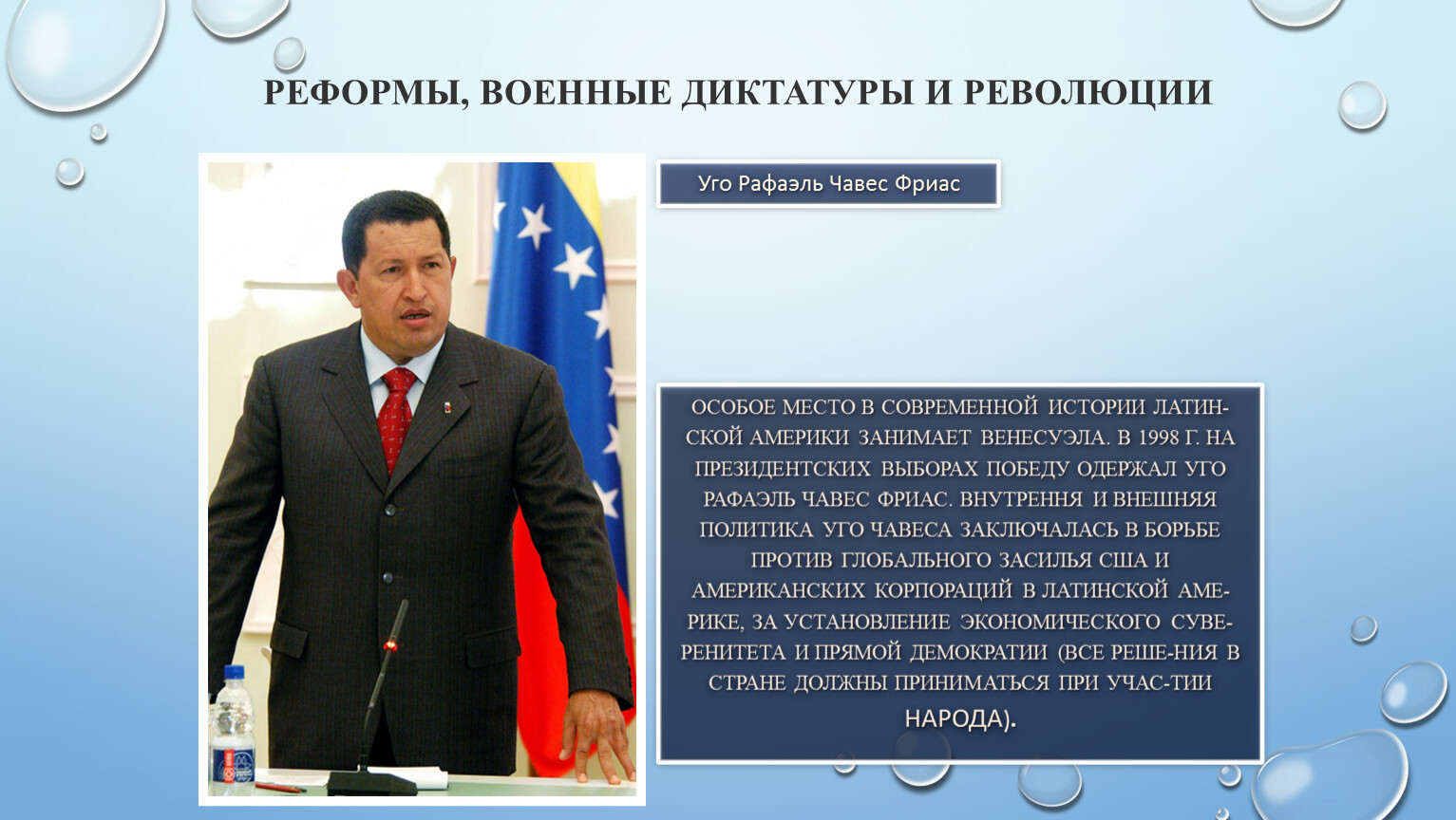 Особое место в современной истории Латин-ской Америки занимает Венесуэла. В 1998 г. на президентских выборах победу одержал Уго Рафаэль Чавес Фриас. Внутрення и внешняя политика Уго Чавеса заключалась в борьбе против глобального засилья США и американских корпораций в Латинской Аме-рике, за установление экономического суве-ренитета и прямой демократии (все реше-ния в стране должны приниматься при учас-тии народа).