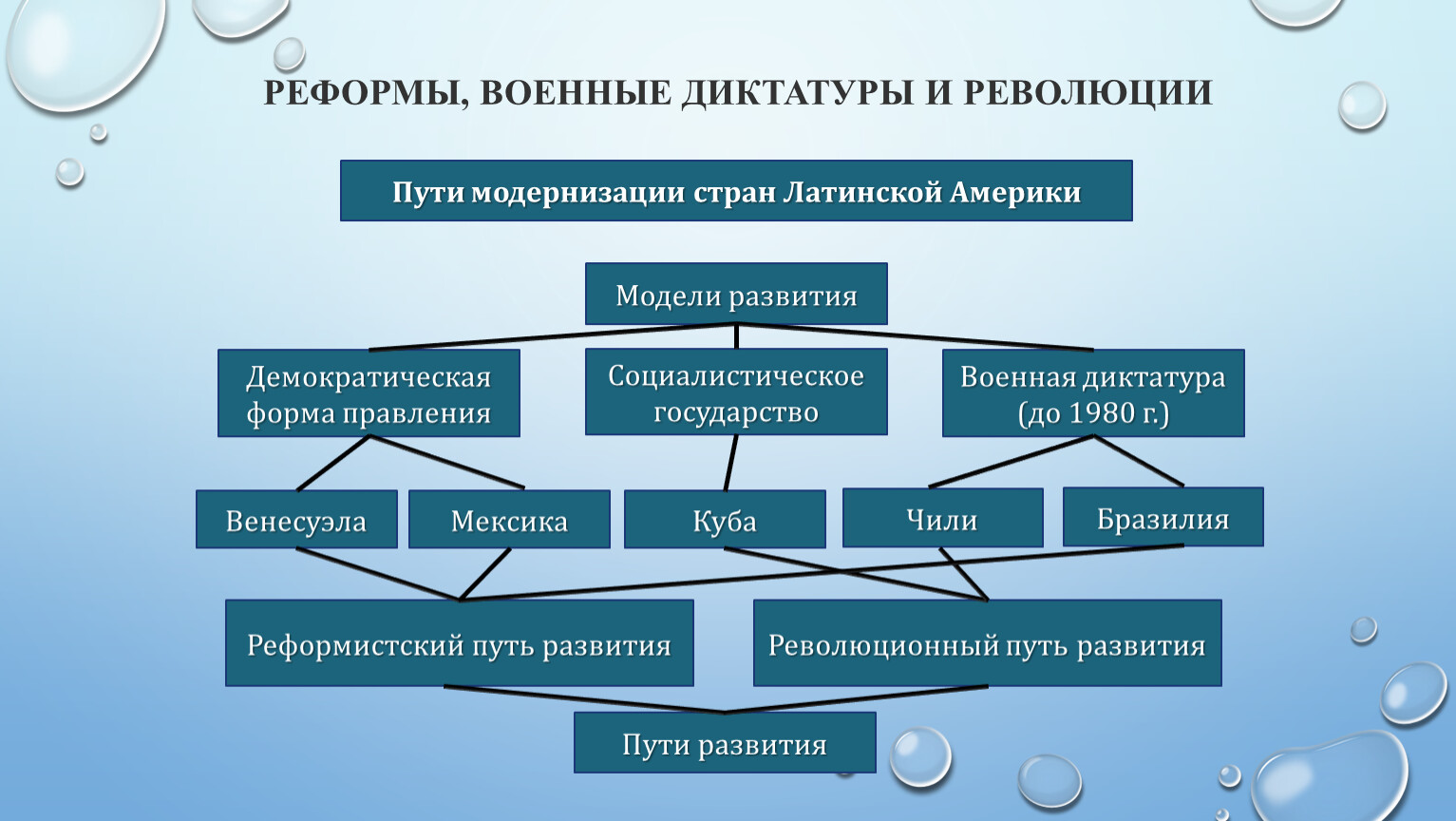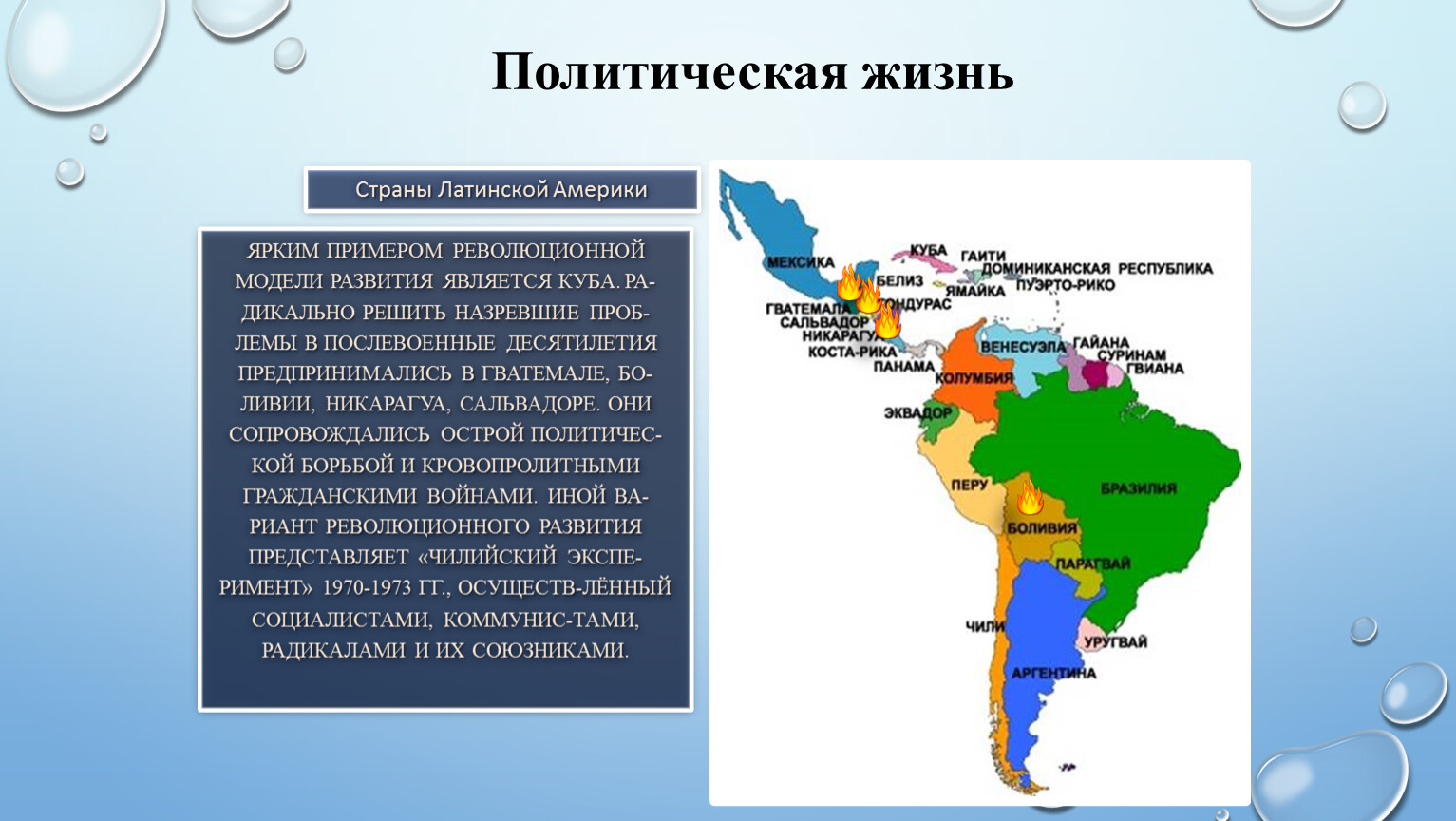 Ярким примером революционной модели развития является Куба. Ра-дикально решить назревшие проб-лемы в послевоенные десятилетия предпринимались в Гватемале, Бо-ливии, Никарагуа, Сальвадоре. Они сопровождались острой политичес-кой борьбой и кровопролитными гражданскими войнами. Иной ва-риант революционного развития представляет «чилийский экспе-римент» 1970-1973 гг., осуществ-лённый социалистами, коммунис-тами, радикалами и их союзниками.