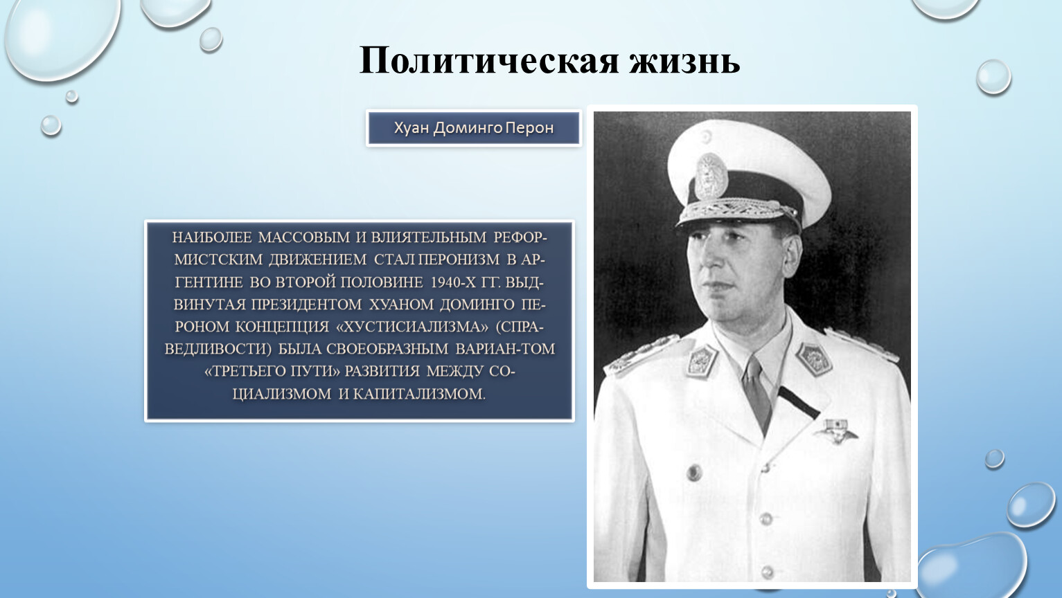 Наиболее массовым и влиятельным рефор-мистским движением стал перонизм в Ар-гентине во второй половине 1940-х гг. Выд-винутая президентом Хуаном Доминго Пе-роном концепция «хустисиализма» (спра-ведливости) была своеобразным вариан-том «третьего пути» развития между со-циализмом и капитализмом.