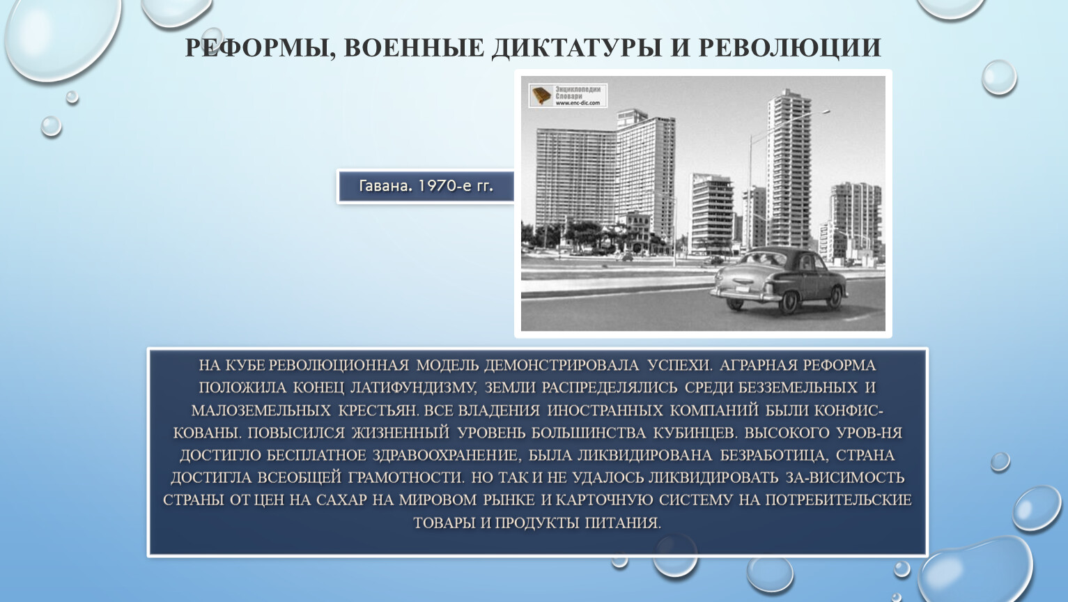 На Кубе революционная модель демонстрировала успехи. Аграрная реформа положила конец латифундизму, земли распределялись среди безземельных и малоземельных крестьян. Все владения иностранных компаний были конфис-кованы. Повысился жизненный уровень большинства кубинцев. Высокого уров-ня достигло бесплатное здравоохранение, была ликвидирована безработица, страна достигла всеобщей грамотности. Но так и не удалось ликвидировать за-висимость страны от цен на сахар на мировом рынке и карточную систему на потребительские товары и продукты питания.