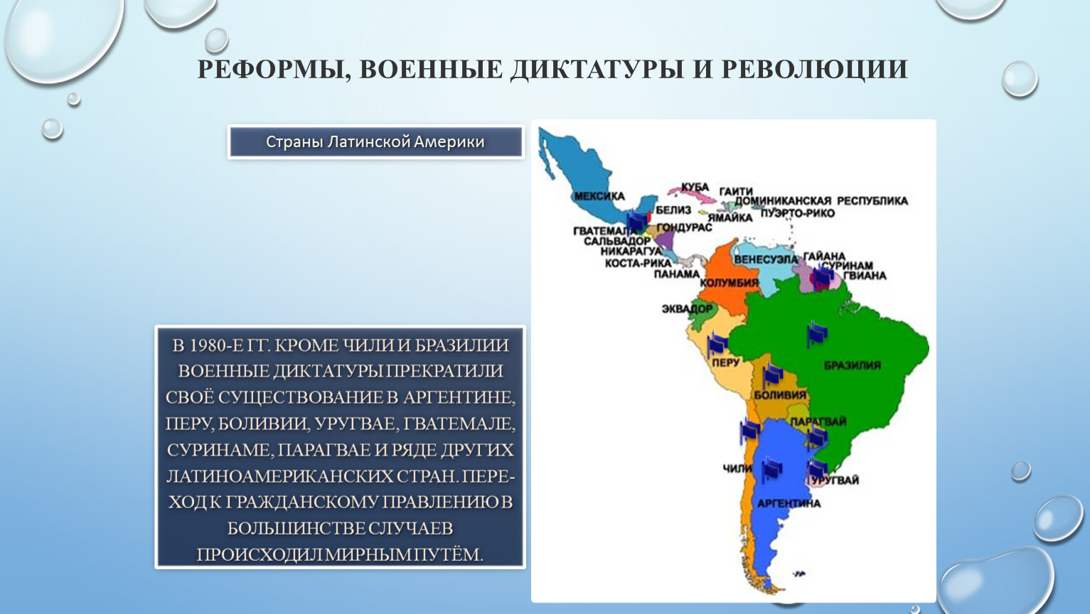 В 1980-е гг. кроме Чили и Бразилии военные диктатуры прекратили своё существование в Аргентине, Перу, Боливии, Уругвае, Гватемале, Суринаме, Парагвае и ряде других латиноамериканских стран. Пере-ход к гражданскому правлению в большинстве случаев происходил мирным путём.
